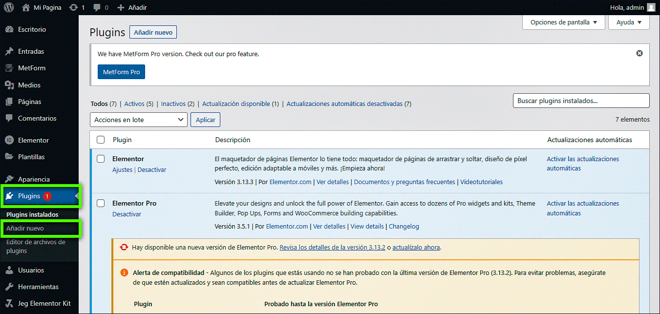 2. Una vez dentro del WordPress, nos ubicamos en la margen izquierda Plugins, añadir nuevo.