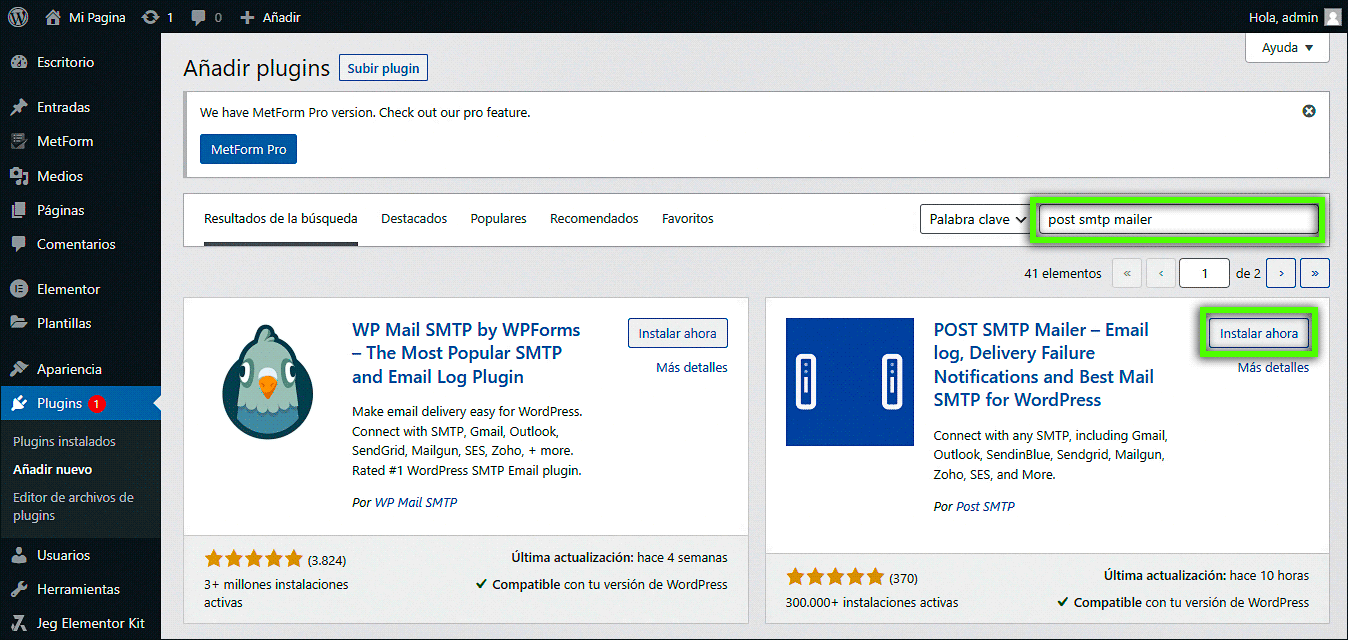3. En el buscador escribir Post SMTP Mailer y luego clic en instalar ahora, para después activar.
