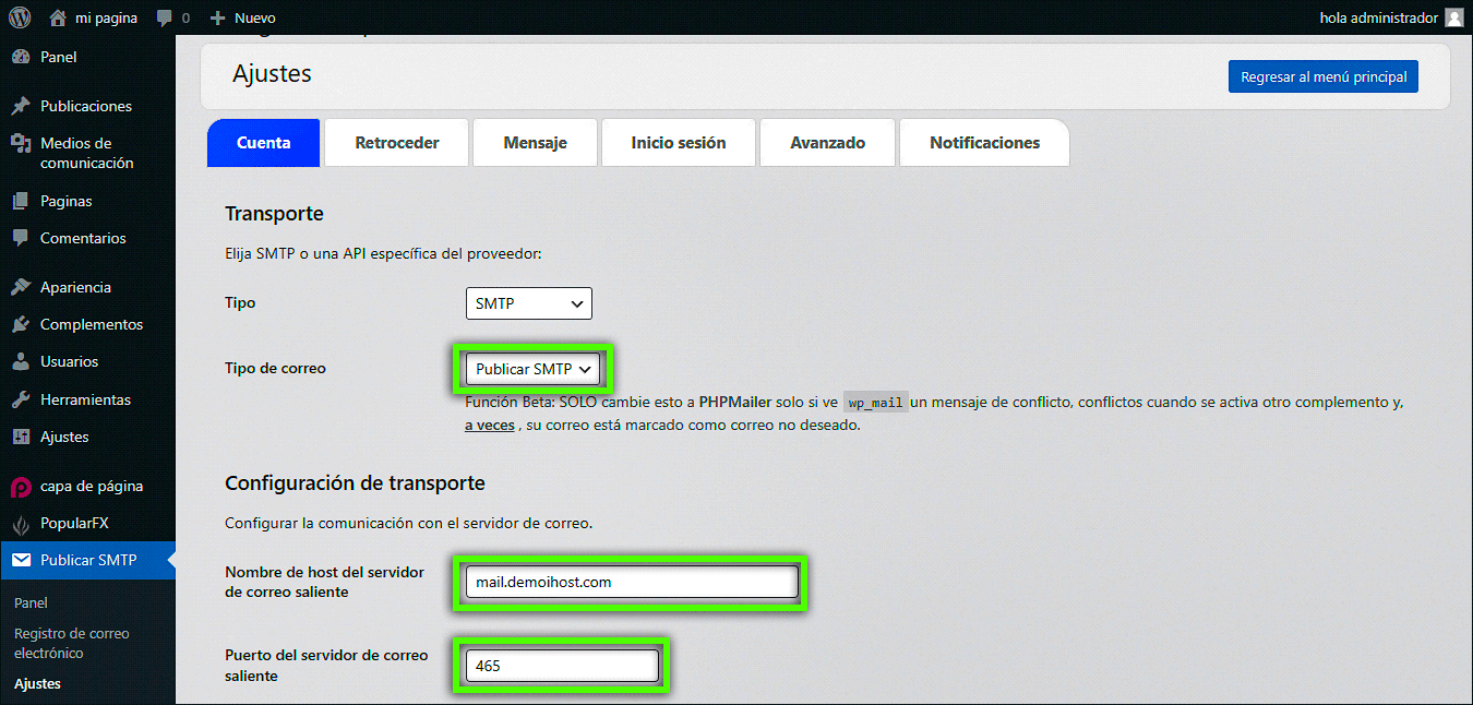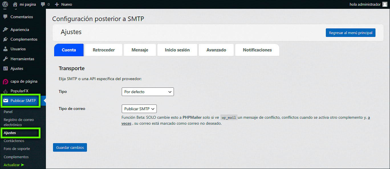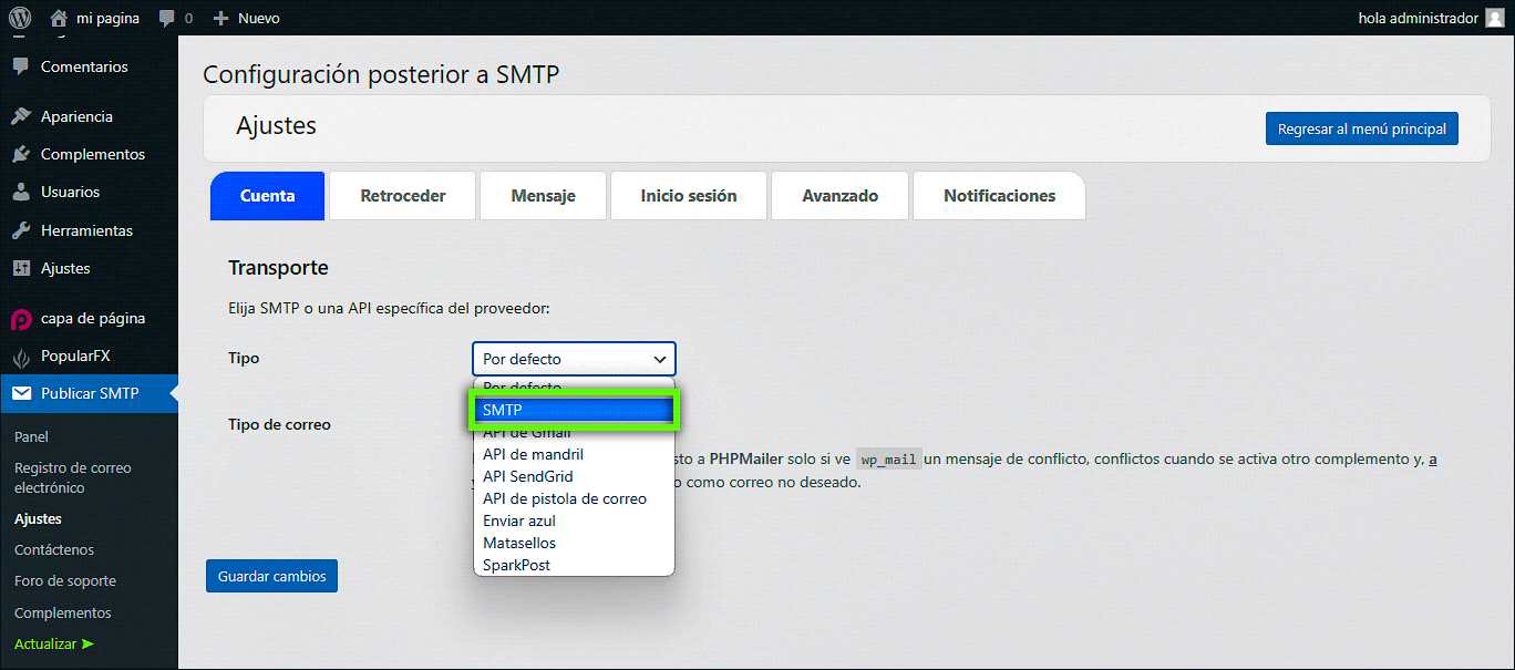 8. En tipo de correo, se deja por defecto en Publicar SMTP (Post SMTP). En Configuración de transporte ingresamos los datos del servidor de salida de nuestro correo.