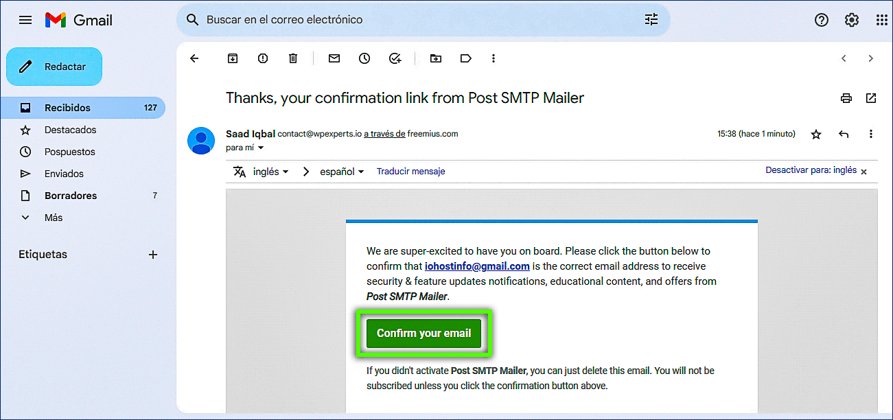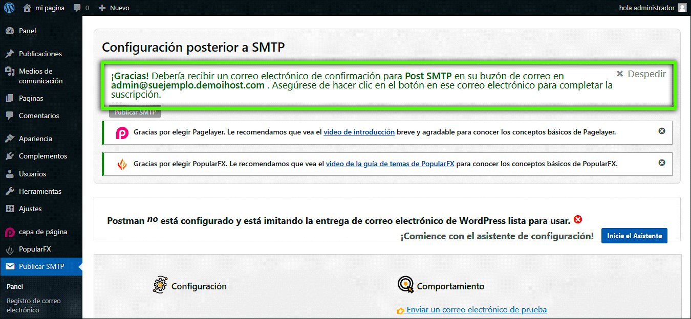 4. Cuando usted le dé en activar automáticamente le mostrará esta ventana de confirmación de Post SMTP.