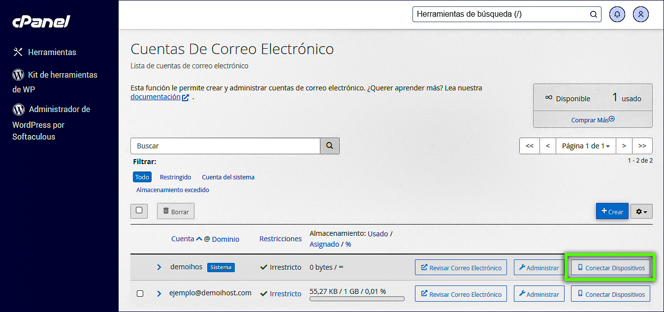 2. Presione el botón de Conectar dispositivos en el correo que desea saber los datos.
