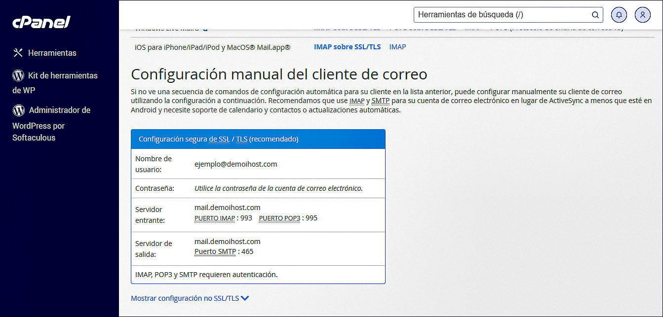 3. Aquí, podemos observar los datos necesarios para hacer la configuración de nuestro correo.