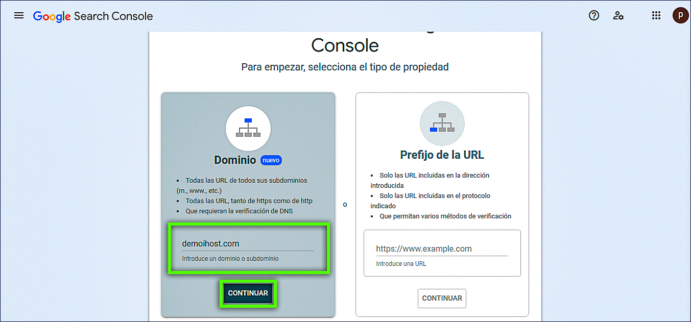 4. Se le mostrará una ventana de bienvenida, en Dominio escriba el nombre de su dominio y clic en continuar.