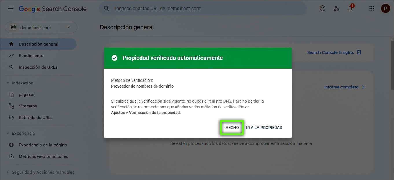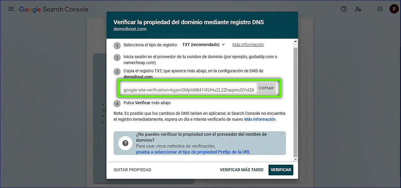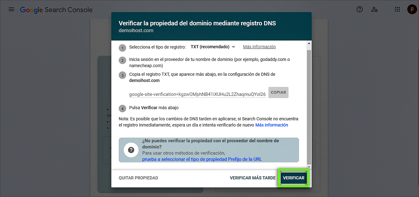 11. Si le sale una ventana de NO SE HA PODIDO VERIFICAR LA PROPIEDAD, entonces debe de esperar un poco más a que se propaguen los cambios de DNS.