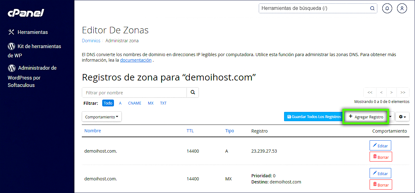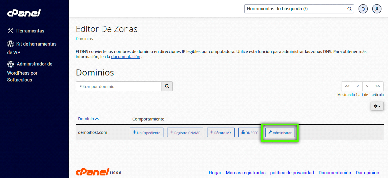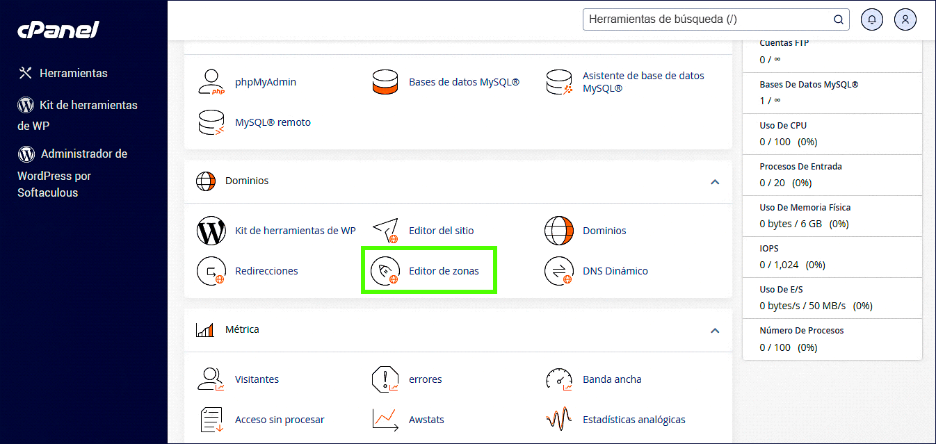 6. Abra su cPanel y en la sección de Dominios seleccione Editor de zonas.
