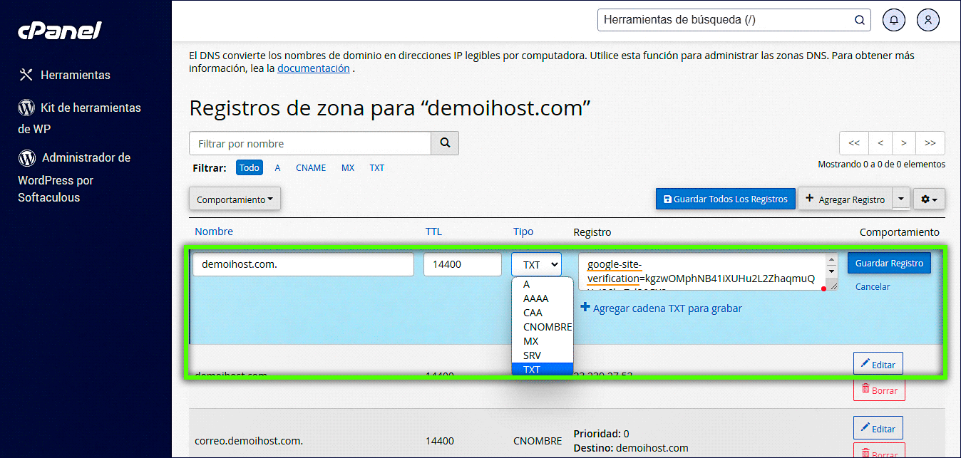 Registro: Aquí debe de copiar el texto guardado de Google search console.