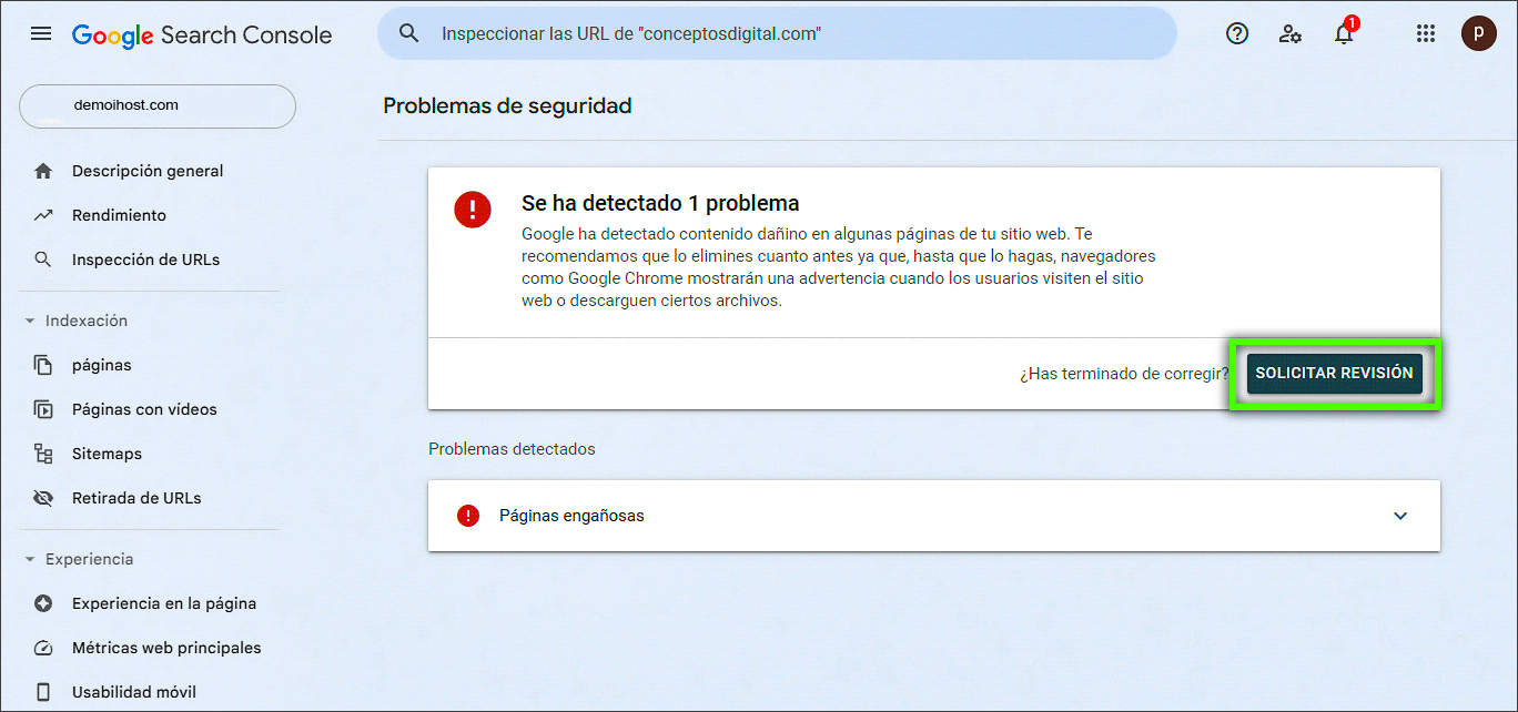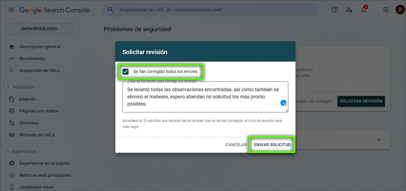 13. Cuando se haya cerrado la ventana, haga clic en solicitar revisión.