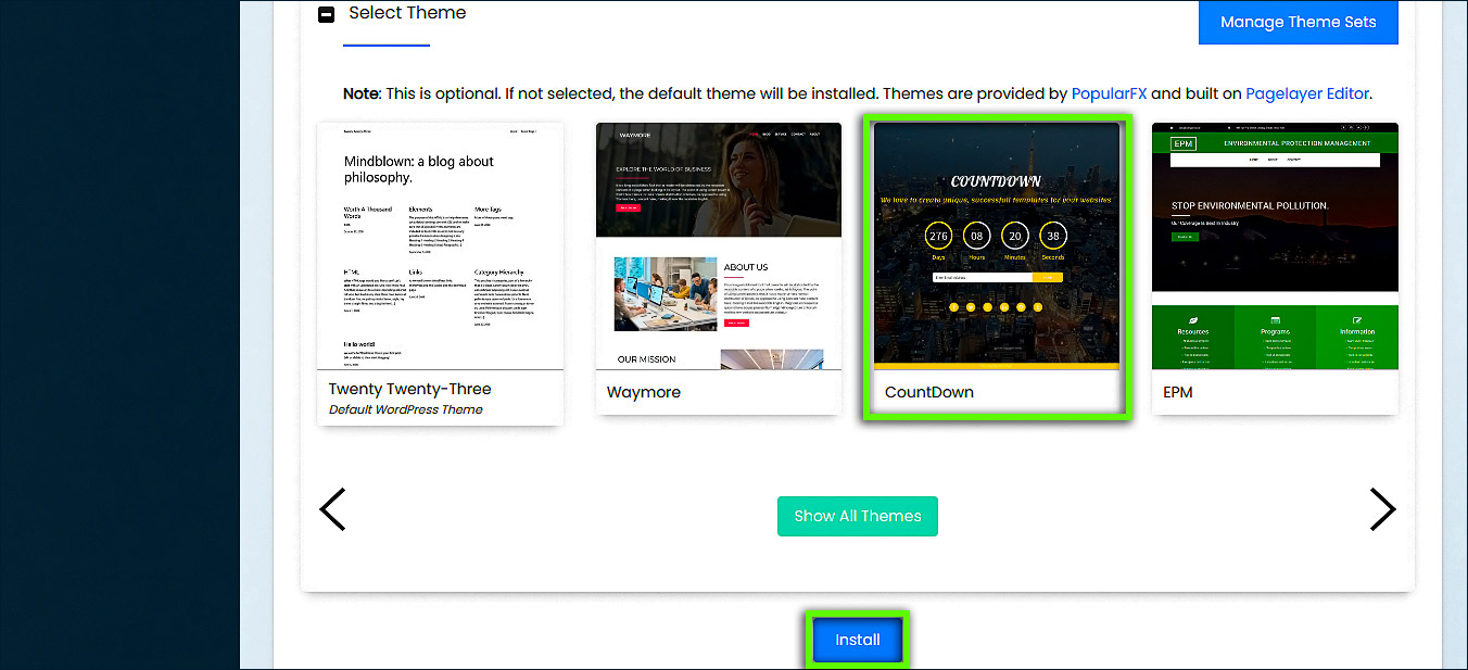 6. Seleccione el tema de su preferencia. Terminado de rellenar el formulario haga clic en el botón Instalar (Install) en la parte inferior de la página.