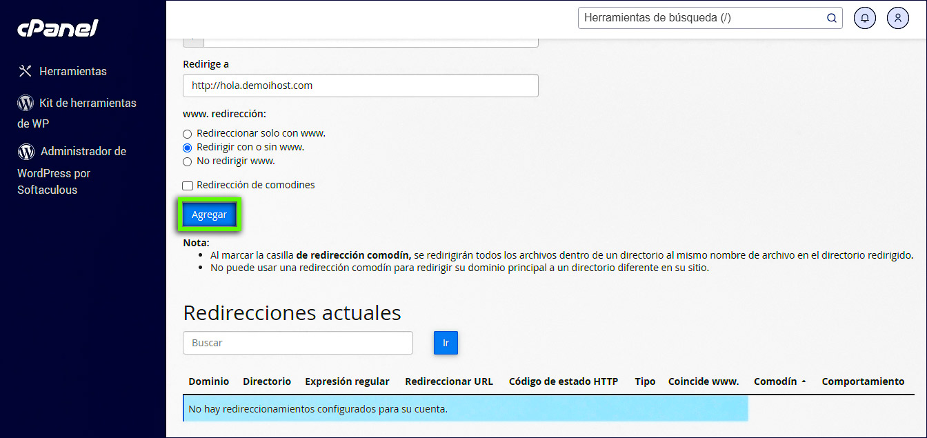 8. Haga clic en Agregar para crear la redirección según lo especificado.