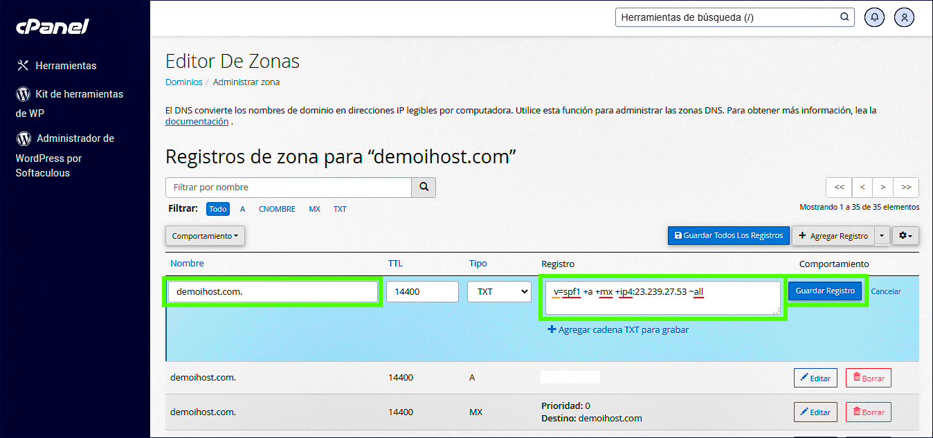 6. Agregamos un registro donde el nombre es el dominio, el tipo es TXT y en registro introducimos el texto para hacer clic en guardar registro.
